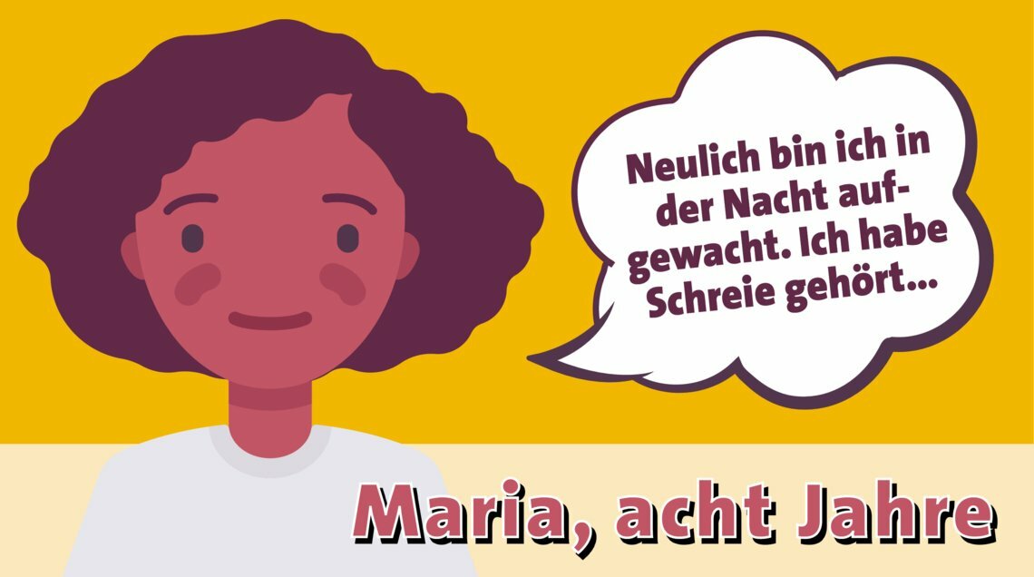 Neulich bin ich in der Nacht aufgewacht. Ich habe Schreie gehört. Laute Schreie von meinem Vater. Und leises Weinen von meiner Mutter. Ich bin die Treppe runtergeschlichen, um zu sehen, was los ist. Mein Vater hat meine Mutter geschlagen! Ich wollte ihr helfen. Aber ich hatte unheimliche Angst vor meinem Vater. Er war rot vor Zorn. Immer wieder hat er zugeschlagen und dabei gelacht! So habe ich ihn noch nie gesehen! Ich habe die Hände auf meine Ohren gepresst. Ich wollte dieses fiese Lachen nicht mehr hören. Warum hat er das gemacht? Ob das meine Schuld war?